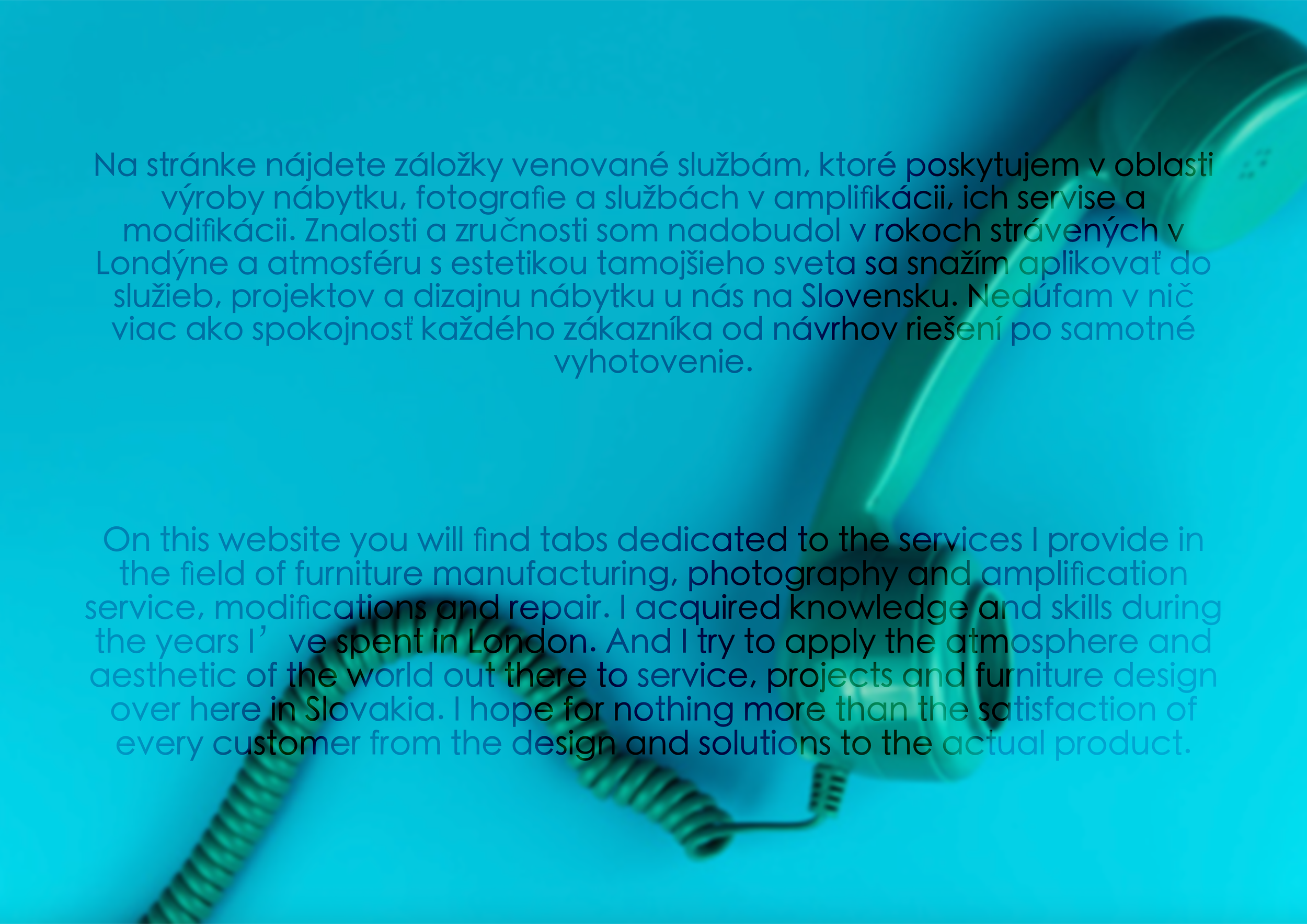 Návrhy a design nábytku, kuchynských liniek na mieru s netradičným poradenstvom vo výbere materiálov a trpezlivým prístupom, pretože som sa nielen roky venoval tejto problematike a zákazníckemu servisu vo Veľkej Británii, pričom čerpal inšpiráciu v prostredí luxusných londýnskych nehnuteľností, no taktiež pracoval so zákazníkmi v oblasti rámovania obrazov a umeleckých diel a spolupracoval s galériami, kde nebol priestor na nevrlé správanie. Nestane sa vám, že by ste u nás narazili na uponáhľané návrhy. Rešpektujeme vaše prostredie na život ako miesto, ktoré potrebuje čas na nápaditosť a vhodné usporiadanie. Vizualizácia a 3D modely sú samozréjmosťou a samotná produkcia je v precíznom prevedení. Nemám záujem o premnožené množstvá, ale zariaďovať priestor s nadšením ako v príbehoch, ktoré som si priviezol z diaľok, ulíc veľkomesta a stretnutí s obyčajnými i slávnymi ľuďmi. Mal som šťastie byť stolár, tlačiar, fotograf i rámovač obrazov.